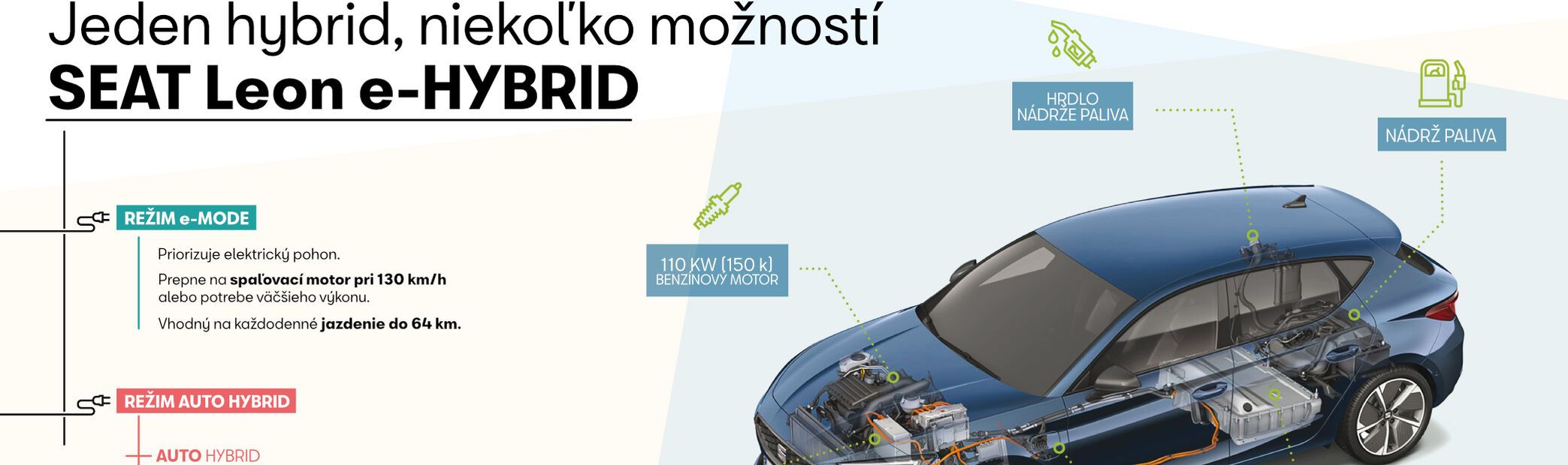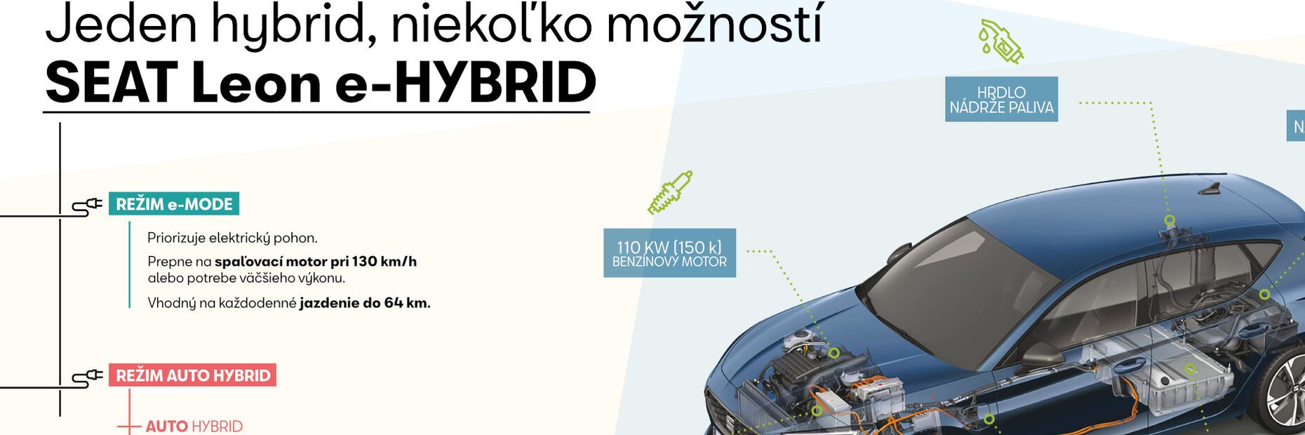 Na optimálne využitie predností pohonu plug-in hybrid je dôležité dobre poznať jeho konštrukciu a funkciu. Plug-in hybrid má všetky komponenty pohonu spaľovacím motorom a elektrického pohonu. Má dva motory, jeden spaľovací s nádržou paliva a jeden elektromotor s batériou. Batéria elektrického pohonu sa nabíja rekuperáciou (premenou pohybovej energie na elektrickú) pri spomaľovaní a brzdení alebo z vonkajšieho zdroja - elektrickej zásuvky alebo nabíjacej stanice. "Motory môžu pracovať samostatne, no keď je potrebný väčší výkon, môžu pracovať aj súčasne. Kombinácia obidvoch motorov modelu Leon e-HYBRID poskytuje systémový výkon 150 kW (204 k)," hovorí riaditeľ pre vývoj hybridného a elektrického pohonu značky SEAT.
